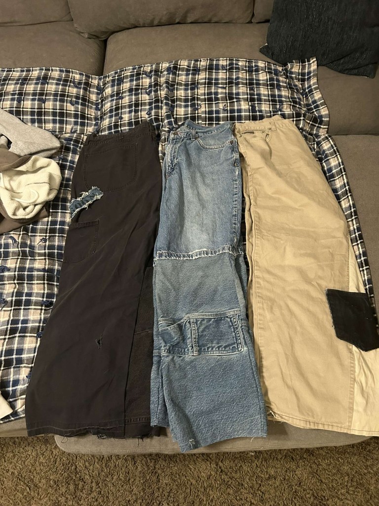 What kind of products do you use to make these sewn pants? “I use the Stinger M1150 sewing machine, And I use pretty much any fabric that looks good and works well with the material I’m putting it on.”