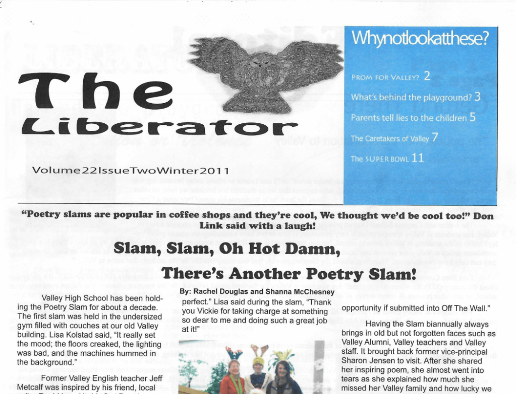 Vickie Barker, a Valley English teacher, was appointed to lead the slam and the publication “Off The Wall” after Mindy Dummer left to explore new horizons. Despite the challenge, Vickie successfully hosted the event with help from MCs Ian Wallace, Courtney Solt, and Heather Rapp. “It was scary since it is something close to Lisa’s heart,” Vickie said. “I just wanted it to be perfect.” Lisa said during the slam, “Thank you Vickie for taking charge at something so dear to me and dong such a great job at it!”