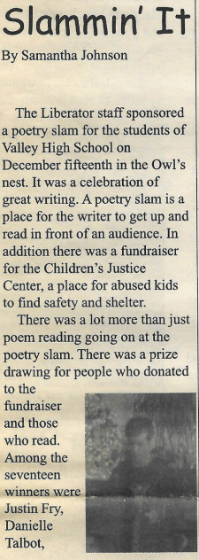 The liberator staff sponsored a poetry slam for the students of Valley High School on December 15th in the Owl’s Nest. It was a celebration of great writing. A poetry slam is a plave for the writer to get up in front of an audience. In addition there was a fundraiser for the Children’s Justice Center, a place for abused kids to find safety and shelter.