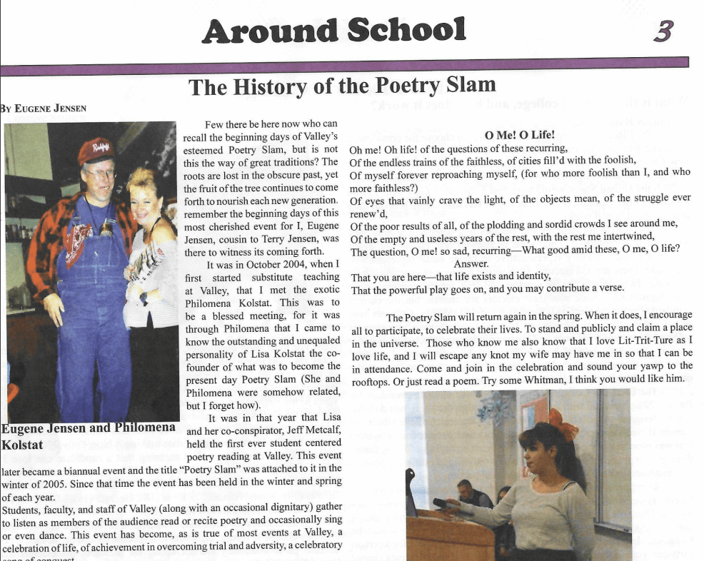 It was in that year that Lisa Eugene Jensen and Philomena Kolstat and her co-conspirator, Jeff Metcalf, held the first ever student centered poetry reading at Valley. This event later became a biannual event and the title “Poetry Slam” was attached to it in the winter of 2005. Since that time the event has been held in the winter and spring of each year.