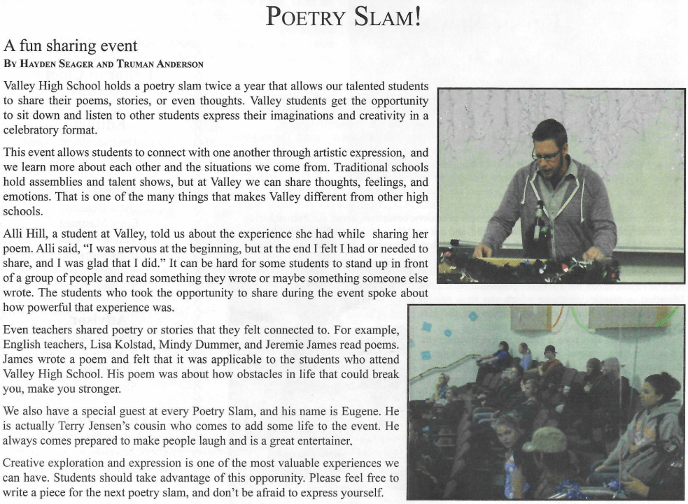 Valley High School holds a poetry slam twice a year that allows our talented students to share their poems, stories, or even thoughts. Valley students get the opportunity to sit down and listen to other students express their imaginations and creativity in a celebratory format.