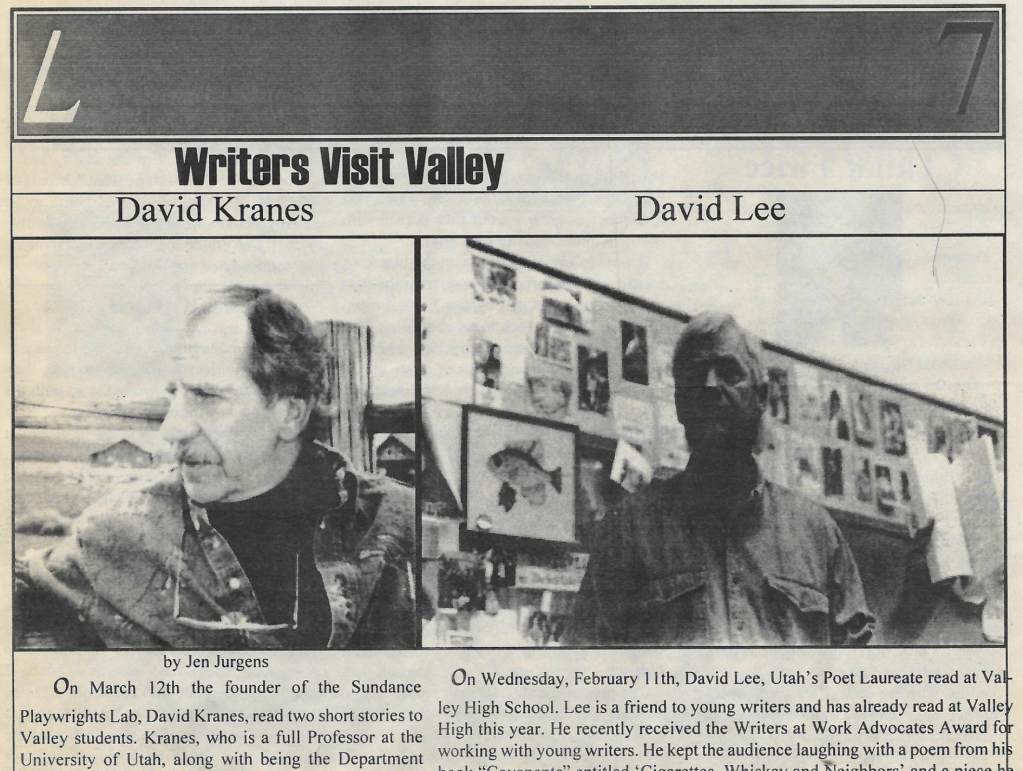 On Wednesday, February 11th, David Lee, Utah’s Poet Laureate, read at Valley High School. Lee is a friend to young writers and has already read at Valley this year. He recently received the Writers at Work Advocates Award for working with young writers. He kept the audience laughing with a poem from his book “Covenants” entitled ‘Cigarettes, Whiskey and Neighbors’ and a piece he wrote for our own Jeff Metcalf called ’21 Gun Salute’. Following the reading, he opened a question and answer period in which we learned that even a Poet Laureate has to re-write his work several times before it is complete.